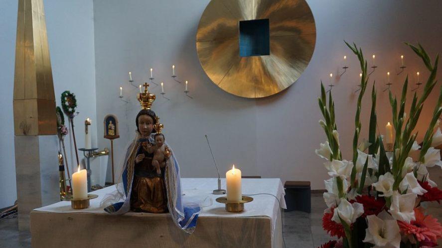 Mit der Kräuterweihe der mitgebrachten Kräuterbuschen fand der Gottesdienst seinen Abschluss. Die Gnadenfigur wurde von Dekan Krammer zurück in die Kirche getragen und von Bernhard Kretz hoch über dem Altar an ihren Platz in der Mitte der goldenen Scheibe gestellt. Hier wachte sie über die Gläubigen, die den weiteren Andachten beiwohnten und die Nacht auf dem Maria Ehrenberg beten, in Gedanken versunken, in leise Gespräche vertieft oder auch schlafend verbrachten.