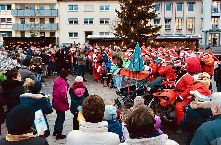 Doch die Musiker nahmen die Herausforderung dankbar an und kamen auf die stolze Zahl von 75 Teilnehmern im Weihnachtsmann-Kostüm. Dirigent Ralf Gundelach hatte sich für die Wette sogar als dirigierender Elch verkleidet. Stimmgewaltig brachte der Musikzug sein Ständchen zu den Klängen des legendären deutschen Songs "Freiheit" dar. Die zahlreichen Zuschauer auf dem Rathausplatz staunten nicht schlecht. Als Wetteinsatz gab es im Anschluss eine Geldspende für den Verein.