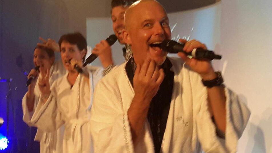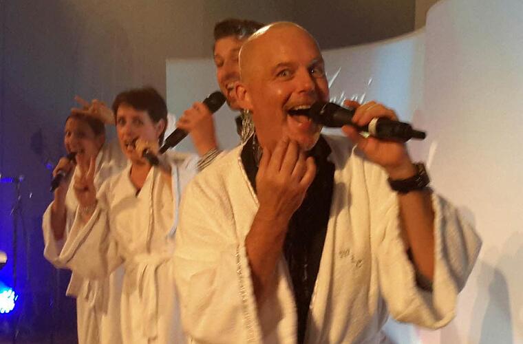 Für das Finale hatten sich die Künstler dann noch einen optischen Gag einfallen lassen. Wie seinerzeit Udo Jürgens am Schluß seiner Konzerte kamen auch die Sängerinnen und Sänger im weißen Bademantel auf die Bühne.