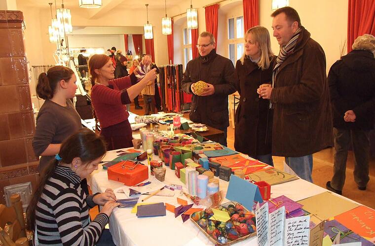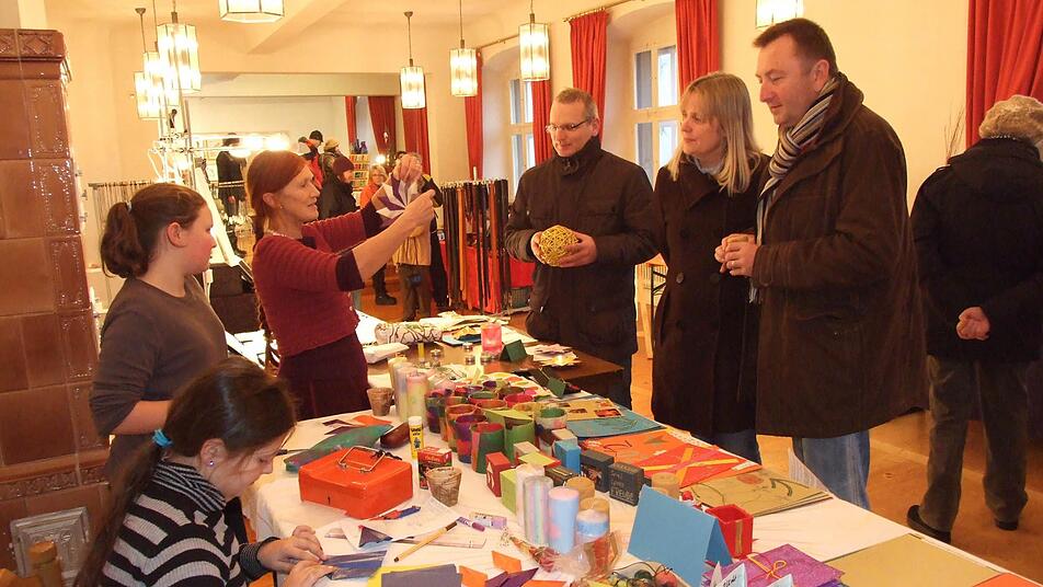 Die Verkaufsstände nehmen das gesamte Erdgeschoss sowie den Theatersaal, die Bühne und den Vorraum im ersten Stock in Beschlag.Offeriert werden Hüte und Mützen unterschiedlichster Herstellungsverfahren, Schals, Röcke und Westen sowie handgestrickte Socken. Dann stehen kunstvolle Patchworkarbeiten sowie individuell aus attraktiven Stoffen Genähtes wie Kosmetiktäschchen, Dinkelkissen und Stofftiere zum Verkauf. Einige Schüler der Holzschnitzschule lassen sich beim Arbeiten über die Schulter schauen. Aber auch individuelle Floristik, Keramik, Laubsägearbeiten oder Schmuckdürfen auf dem Bischofsheimer Weihnachtsmarkt nicht fehlen, ebenso wie eine Bewirtung im Rentamt.