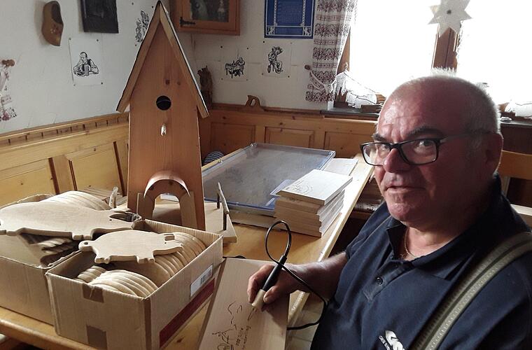 Für die 700-Jahr-Feier hat sich Berthold Morber ins Zeug gelegt: Unzählige Brotzeitbrettchen werden von ihm per Hand mit dem Schönderlinger Logo versehen. "Jedes Brettchen ist ja ein bisschen anders", also müsse er auch seine Gravur individuell gestalten.