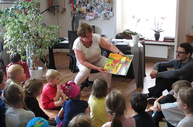 Zum Welttag des Buches fanden bundesweit viele Aktionen rund um Bücher und Lesen statt. Dieses Jahr auch in Bad Brückenau: Die Stadtbibliothek und der Kindergarten Stadtmitte stellten ein buntes Vorleseprogramm für Kinder auf die Beine. Zum Auftakt begrüßte Bibliotheksleiter Jan Marberg die vielen kleinen Gäste, die zur ersten Station ins Rathaus gekommen waren. Bürgermeisterin Brigitte Meyerdierks hatte sich bereit erklärt, die Kinder in ihrem Amtszimmer zu empfangen und las aus dem Buch "Wie Henri Henriette fand" vor. Gebannt lauschten die kleinen Zuhörer der Geschichte um Hahn Henri, der für sein Leben gern kocht, aber dem für seine Rezepte Eier fehlen. Durch eine Kontaktanzeige findet er schließlich Henriette und die beiden werden unzertrennlich. Begeistert von der wundervoll illustrierten Geschichte spendeten die Kinder der Bürgermeisterin großen Beifall.
