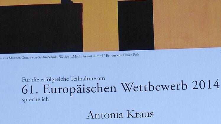 Verena Bedenk, Kunstlehrerin am Franz-Miltenberger-Gymnasium, hat im vergangenen Schuljahr Antonia unterrichtet. Der Europäische Wettbewerb war nach Jahrgangsstufen gestaffelt. Die 11. Klasse des vergangenen Schuljahres diskutierte das Thema "Vereinbarkeit von Familie und Beruf". Wie vom Lehrplan vorgesehen, bearbeiteten die Schüler die "Darstellung des Menschen" und kreierten Plakate, mit denen eine fiktive Firma ihre Möglichkeiten zur Vereinbarkeit von Beruf und Familie anpreist.