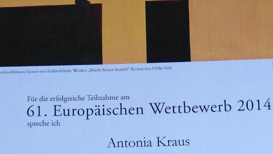 "Alle Eltern wünschen sich erfolgreiche Kinder." Mit diesen Worten hat Antonia Kraus ihr Bild vorgestellt, das sie im Rahmen des Europäischen Wettbewerbes "Work-Life-Balance" gemalt hat. Dass das kindliche Glück bei allem Erfolg oft auf der Strecke bleibt, ist ihr Kritikpunkt. Auf Landesebene hat Antonia mit 200 weiteren Schülern von Regierungspräsident Paul Beinhofer eine Urkunde und einen Buchgutschein erhalten.