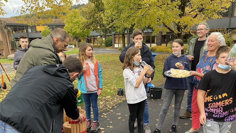 Hausmeister Alexander Baumgart hatte gemeinsam mit den Schülerinnen und Schülern um Franka Helget, Thomas Wollein und Tristen Kleinheinz, den Klassenlehrerinnen Katharina Ziegler, Katharina Lotter und Antje Ferkinghoff sowie dem Elternbeirat mit Simone Beck und Monika Fischer im Pausenhof einen Parcours vorbereitet, auf dem rund 40 Fünftklässler die in Körben und Jutesäcken für sie bereitstehenden Münnerstädter Äpfel waschen, pressen und den frischen Saft gleich kosten durften. "Das riecht nach Apfelwein, schmeckt aber nach Apfelsaft", so das Geschmacksurteil eines Schülers, der den Münnerstädter Apfel schon kannte, "weil mein Vater dort Fußball spielt."