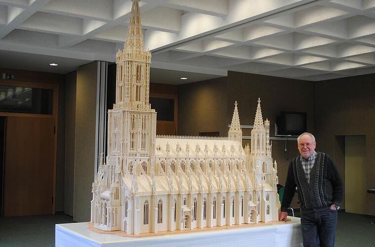 Mitten im Raum stand ein filigraner, beachtlicher 270 cm hoher Nachbau des Ulmer Münsters. Detailgetreu und in allen Kleinigkeiten präzise kopiert, ausgesägt aus Pappelsperrholz und oft mehrlagig übereinander geklebt, um dem Bauwerk Tiefe zu geben.