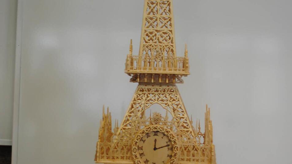 Auch den Eiffelturm, diverse Uhren, Blumenbehälter, Bilderrahmen und Kerzenleuchter hat er als Laubsägearbeiten gefertigt. Nach der Ausstellung im Riedenberger Kinderdorf wird das Münster nun nach Fulda in die Einrichtung Mediana umziehen. Weitere Ausstellungsorte will Arnim Waldau jetzt erst noch suchen.