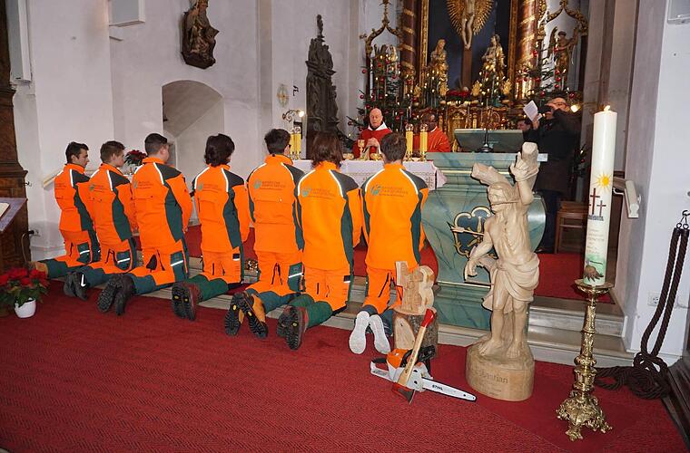 Nicht nur aus Unterfranken kamen die Waldarbeiter und Forstleute zum Kreuzberg. Seit einigen Jahren schließt sich auch der Hessenforst dem Sebastianstag auf dem Kreuzberg an.Dass nicht nur der älteren Generation die Tradition wichtig ist, stellten die Auszubildenden der Forstbetriebe Bad Königshofen, Bad Brückenau und Heigenbrücken unter Beweis. In ihrer Arbeitsuniform versahen sie den Ministrantendienst. Die Klosterkirche präsentierte sich mit ihren sechs Weihnachtsbäumen noch ganz im festlichen Weihnachtsglanz. Zugleich passten die Weihnachtsbäume auch sehr gut zur Sebastiansmesse. Die Figur des Heiligen Sebastians stand vor dem Altarraum.