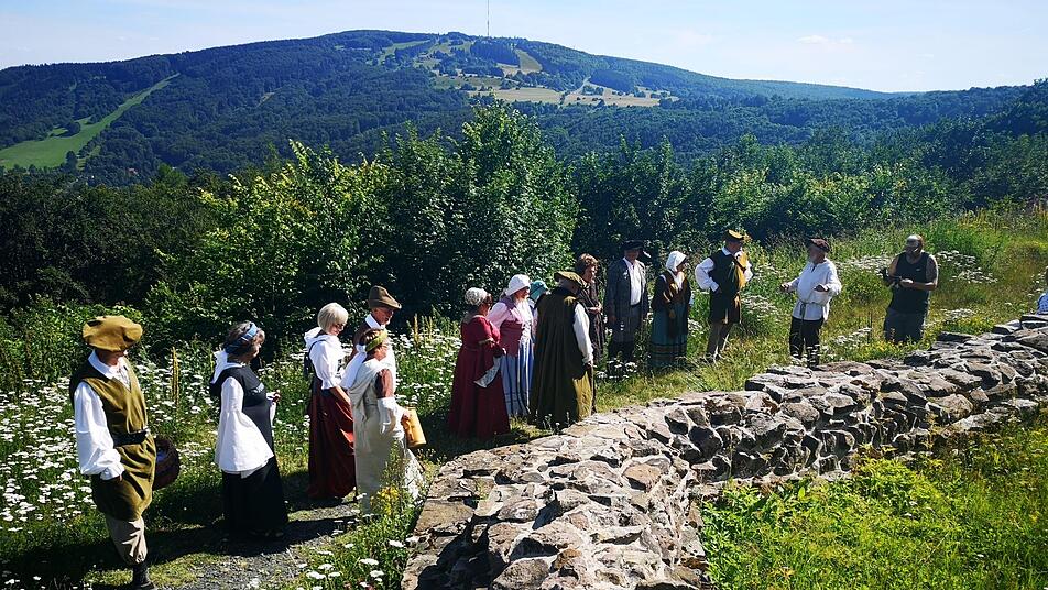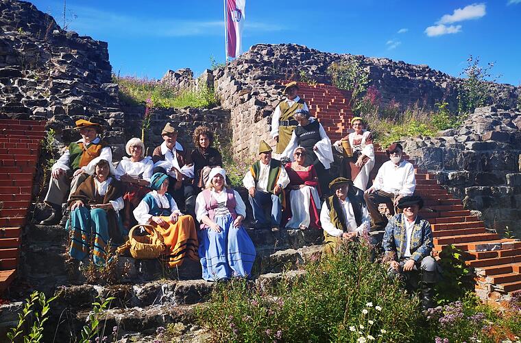 Endlich hat das Wetter gepasst. Herrlicher Sonnenschein und blauer Himmel über der Osterburg bei Bischofsheim: So konnten sich die "Freunde der Osterburg" in ihren historischen Gewändern für Film- und Fotoaufnahmen bestens präsentieren.