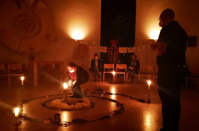 Nahezu dunkel war es in der Kapelle des Kinderdorfes Riedenberg. Auf Leuchtern brannten vier Kerzen, und in die Mitte wurde die brennende Osterkerze gestellt, als Symbol für Jesus Christus. Es war ein besonderer Moment, der Erwartung und Stille.