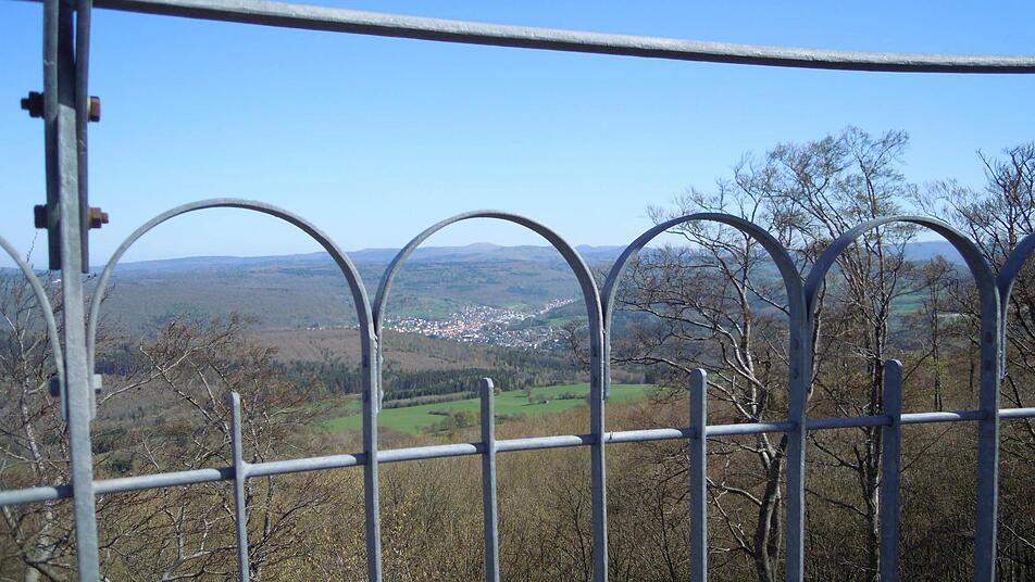Ostwärts liegt die Rhön mit dem Kreuzberg, westwärts reicht der Blick bis zum großen Feldberg im Taunus, südwärts kann man den Steigerwald erkennen und im Norden sieht man sogar bis zum Knüllgebirge.