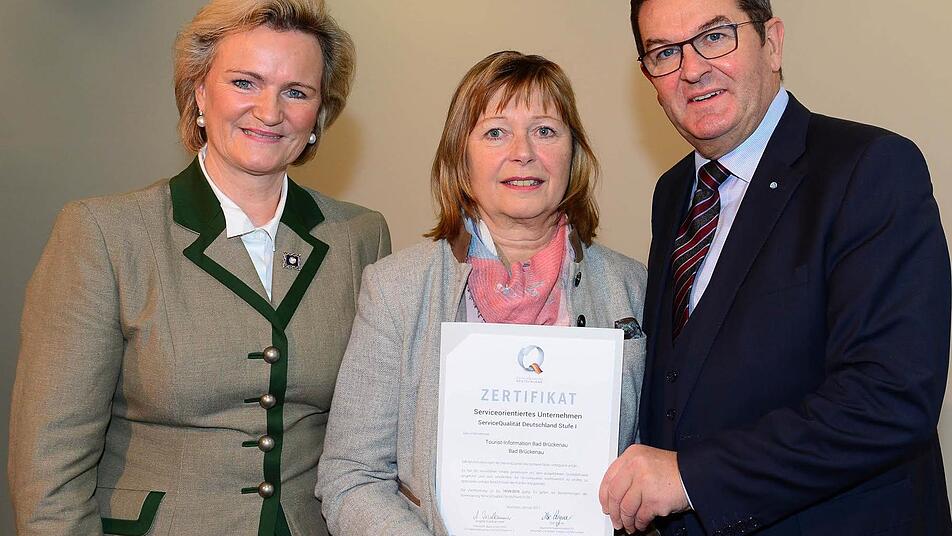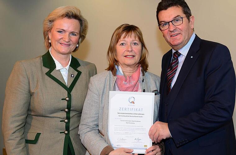 Bayerns Wirtschafts- und Tourismusstaatssekretär Franz Josef Pschierer und die Präsidentin des Bayerischen Hotel- und Gaststättenverbandes Dehoga Bayern, Angela Inselkammer, haben bei der Fachmesse für Hotellerie, Gastronomie und Gemeinschaftsverpflegung in Nürnberg 48 bayerische Unternehmer und Betriebe mit Zertifikaten der ServiceQualität Deutschland in Bayern ausgezeichnet. Unter ihnen war auch Karin Bauer von der Tourist-Information Bad Brückenau.