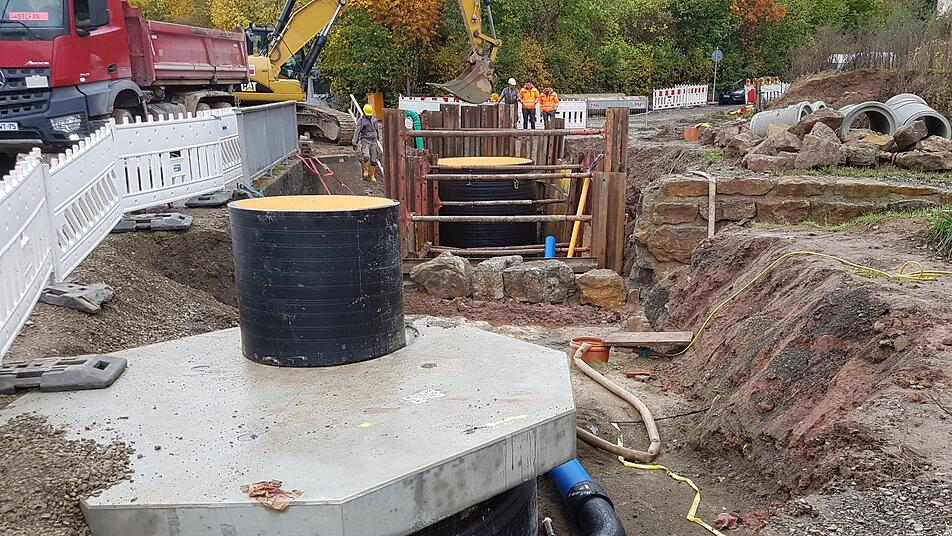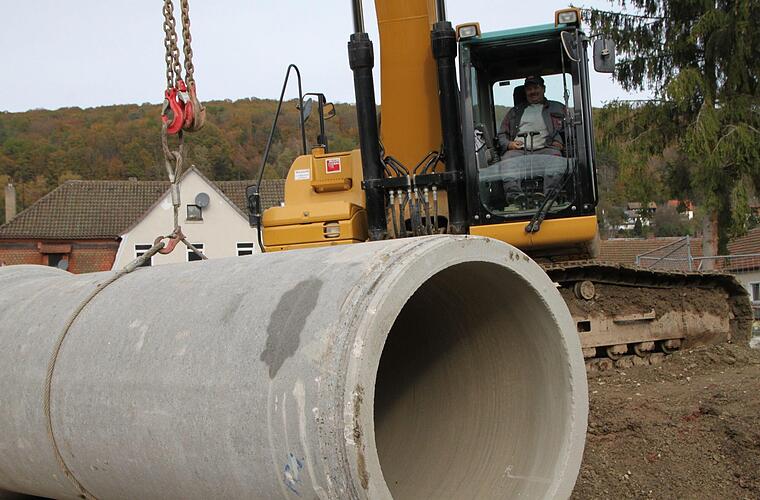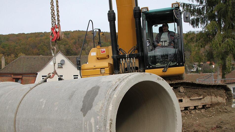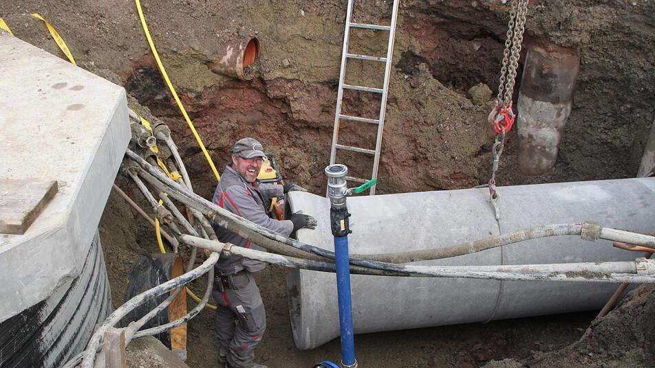 Die Schächte reichen 6,5 Meter in die Erde, berichtet Stefan Metz, Polier der Firma Müller Bau aus Großenbrach. Auflagen des Wasserwirtschaftsamts und andere Belange sorgten dafür, dass die Arbeiten etwas dauerten, erklärt Steinhoff, lobt aber gleichzeitig die Zusammenarbeit aller Beteiligter. Zwischen Bachbett und Kanal seien gut 1,6 Meter Abstand eingehalten worden, schildert Metz. So ist das Gewässer geschützt.