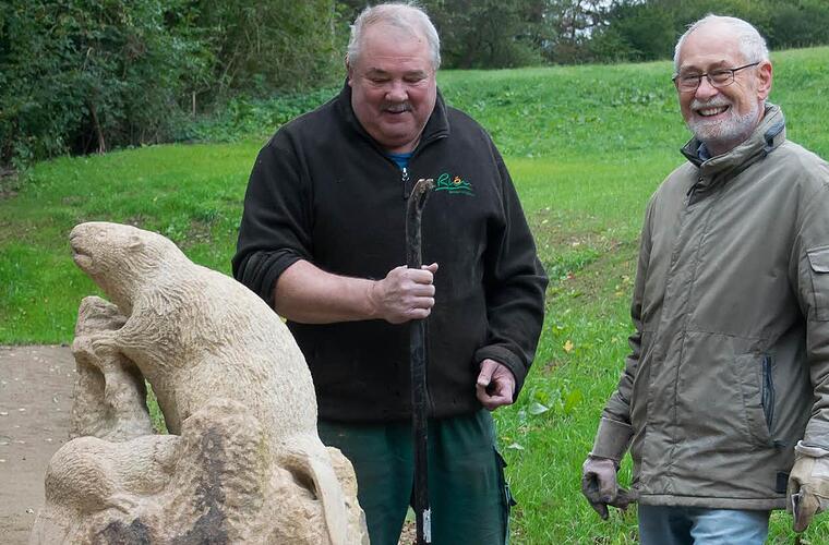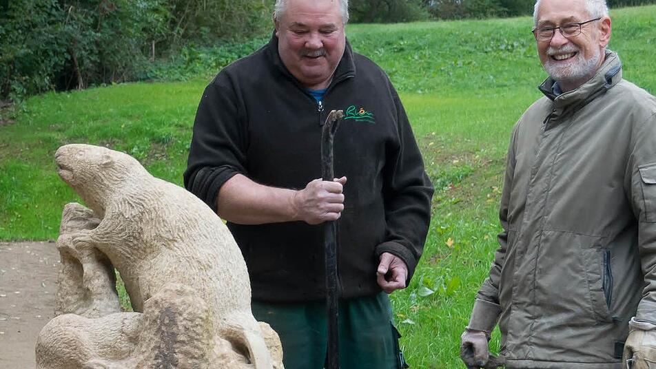 Ein steinerner Biber schmückt die Besucher-Plattform im Wald zwischen Staatsbad und Eckerts. Die Skulptur, die Gerwin Kellermann aus Oberbach gefertigt hat, wurde am Donnerstag aufgestellt. Die Plattform bietet einen guten Ausblick auf die
