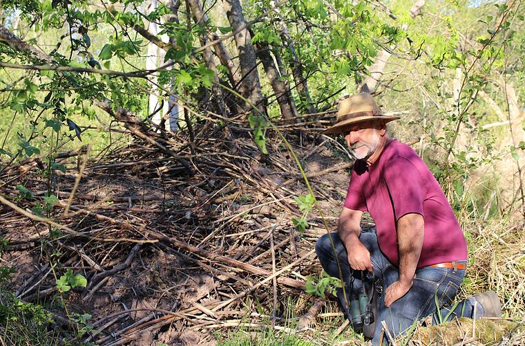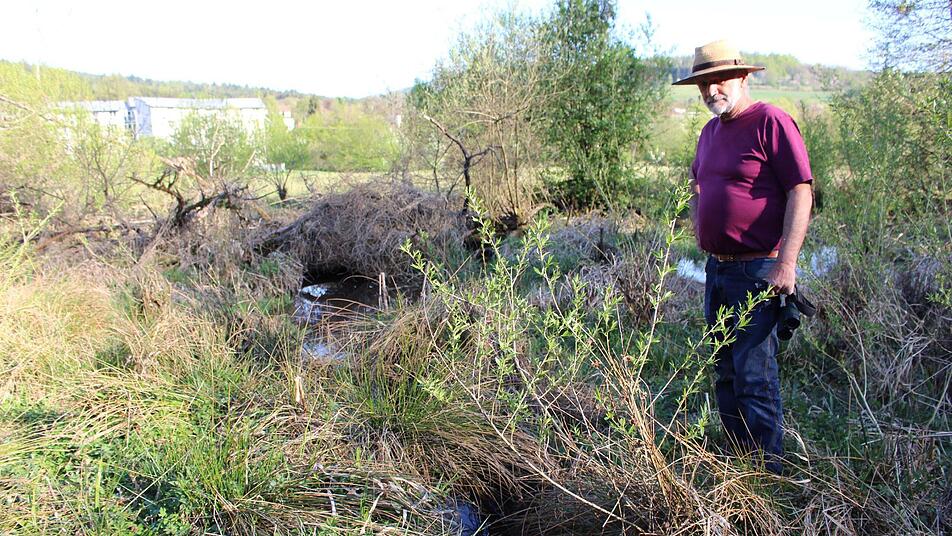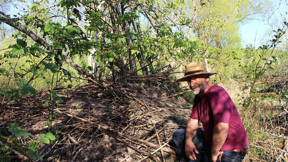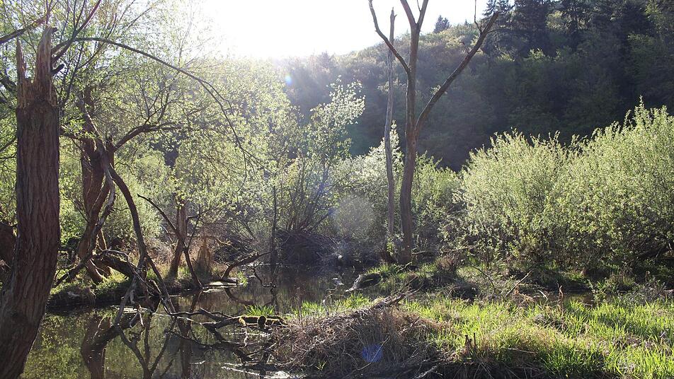 Trotz der großen Trockenheit, die seit Anfang März zum wiederholten Mal im Frühling herrscht, bildet hier ein kleiner Stausee eine ökologische Ausnahme. Die Grundwasserspeicher können sich auffüllen - zumindest aktuell. Und er ist dafür verantwortlich: Der Biber mit seiner Stautätigkeit. "Wir haben vier Reviere zwischen Bad Brückenau und Eckarts, mehr können es hier nicht werden", sagt Robert Hildmann, Biberbetreuer für diesen Abschnitt der Sinn.