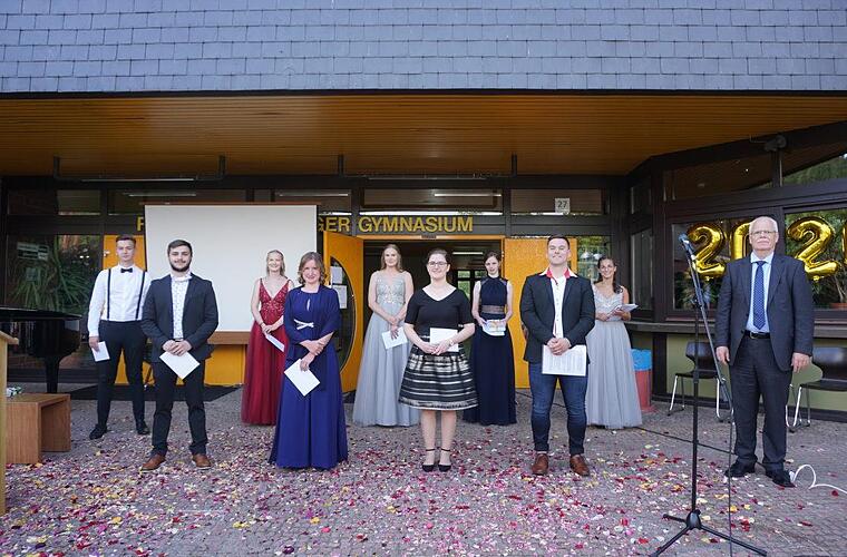 Zu den Geehrten zählen: Andy Martin, Anne Trump (beide mit einer Abiturnote von 1,2), Rebecca Finnern (1,3), Janna Kaufmann (1,4), Vanessa Schmitt (1,4), Anna Schubert (1,4), Celine Schmidt (1,5) sowie die beiden Schulsprecher Edwin Eirich und Dennis Wasilkow.