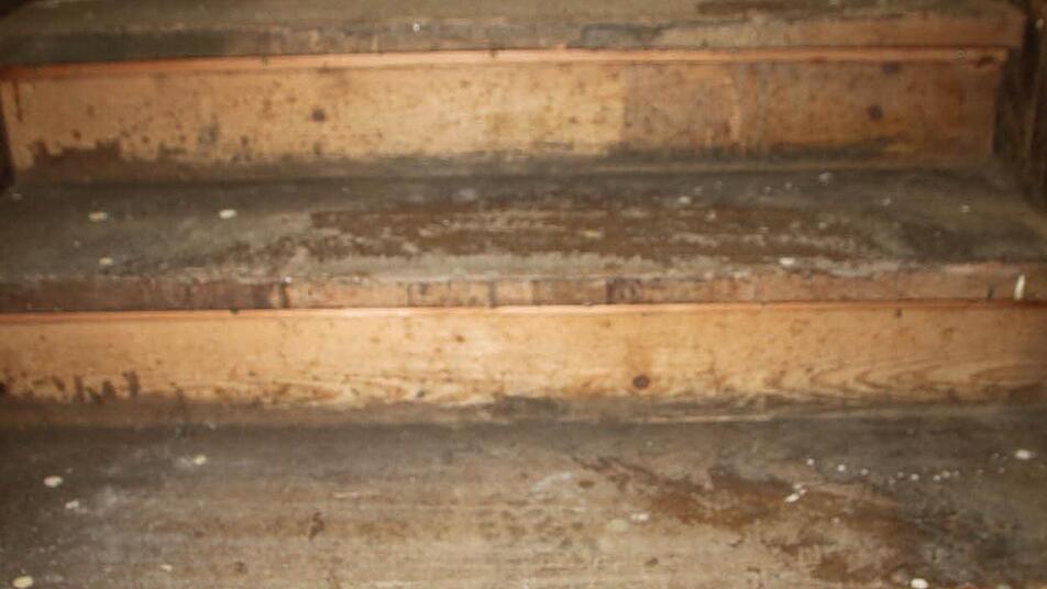 Sie alle liefen über die bekleckste Holztreppe hinauf zur Werkstatt.