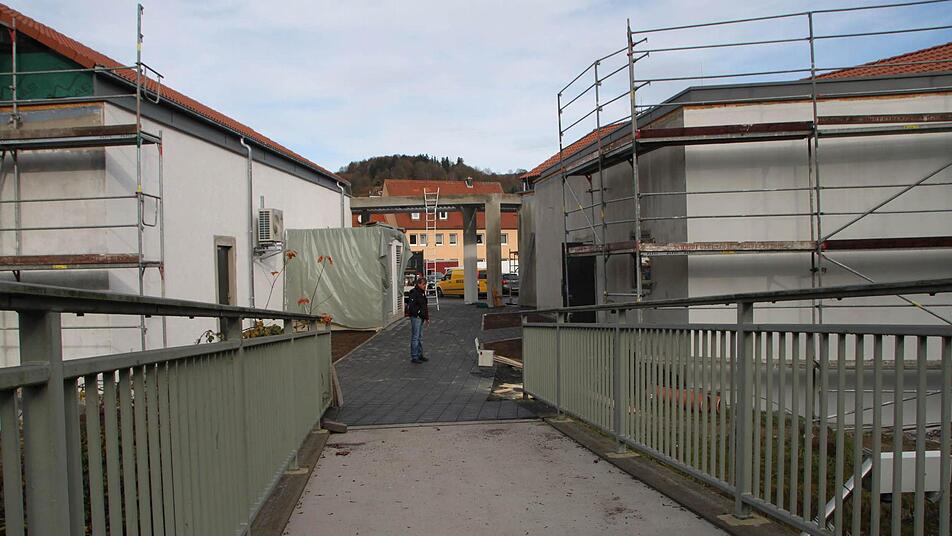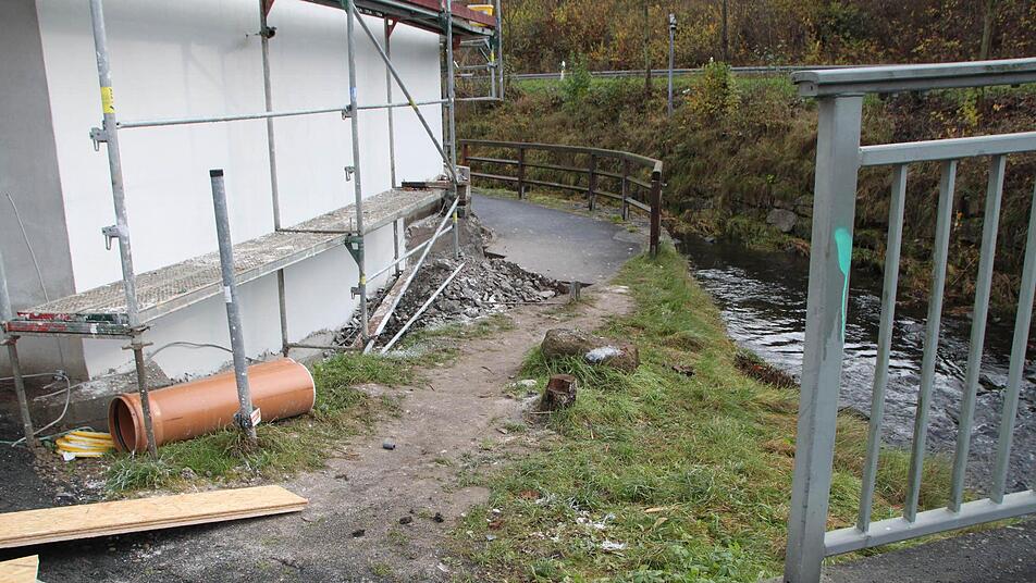 Obwohl das Areal noch eine Baustelle war, kamen etliche Kunden ins Geschäft. "Die Parkplätze sind bis zur Eröffnung definitiv fertig", sagt Polier Joachim Günzel. Einige Restarbeiten - etwa an den Außenanlagen, am Dach oder bei Malerarbeiten - stünden noch an. Auch die Wiederherstellung des Radweges an der Sinn müsse noch in Angriff genommen werden. Ein Blick vom anderen Ufer der Sinn zeigt ganz klar: Hier muss noch etliches gemacht werden, bis die Radfahrer und Spaziergänger wieder ihren gewohnten - und beliebten - Weg an der Sinn entlang nutzen können.