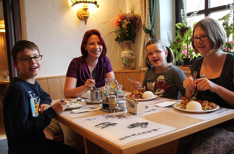 Das freut besonders Familie Reith aus Wartmannsroth. Seit elf Jahren sind sie schon Stammgäste im China-Thai Bistro. "Wir kommen schon lange her", berichtet Mutter Jasmin Reith. "da war unsere große Tochter gerade mal ein dreiviertel Jahr alt." Heute ist Madeleine zwölf. Obwohl sie versucht, sich vegetarisch zu ernähren, gibt es viele Gerichte beim Thai, die sie sehr gern isst. Auch ihre Geschwister, die Zwillinge Benedikt und Leonie, haben ihre Favoriten: Hähnchen süß-sauer und die Pekingsuppe natürlich.