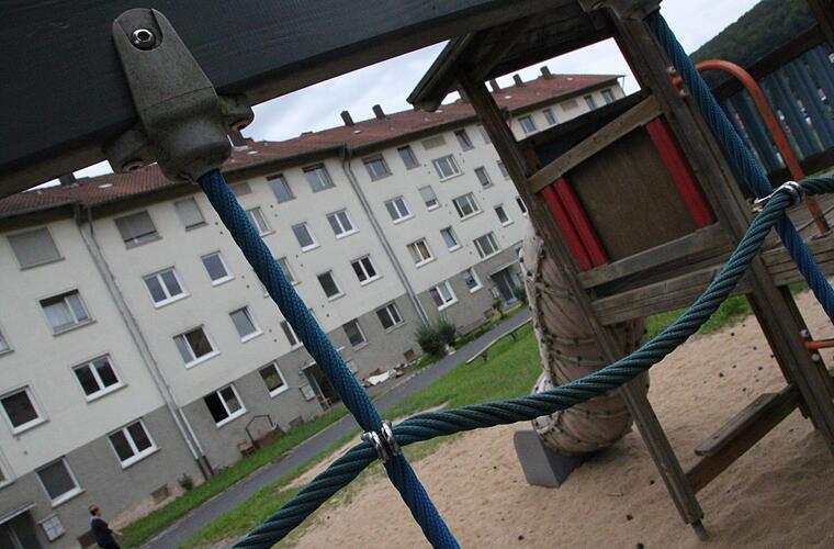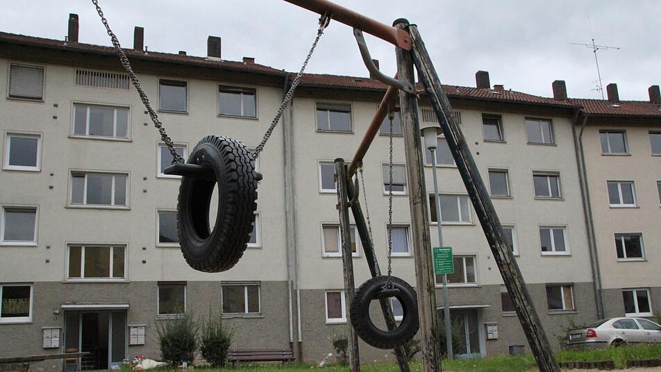 Der Berliner Platz in Bad Brückenau: Fünf Blöcke sind es, die aneinander gereiht hier stehen. Die meisten Fenster gleichen leeren Augen. Nur noch vereinzelt hängen Gardinen hinter den Scheiben. Die Tür von Haus Nummer sechs steht offen. Müll liegt im Eingangsbereich herum. Der Spielplatz ist einigermaßen sauber. Doch Moos an der Rutsche und abplatzende Farbe an den Holzbalken zeugen vom Reparaturbedarf.