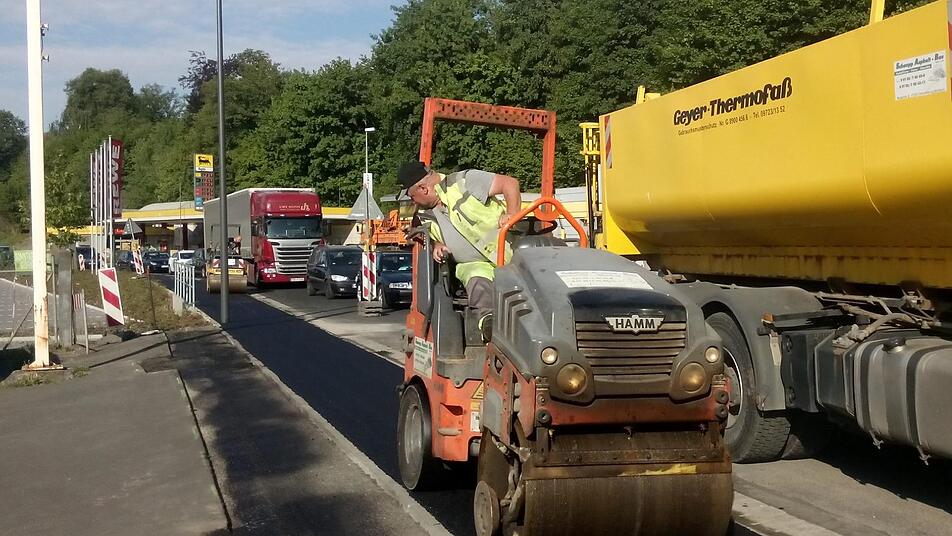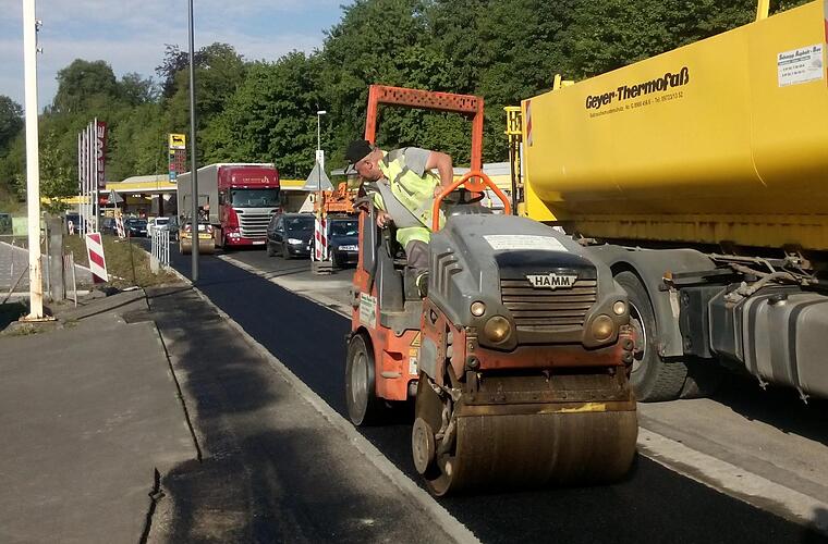 Wenn mal wieder ein Lastwagen, beladen mit Holzstämmen beispielsweise, vorbei donnert, dann ist das eine knappe Angelegenheit. Zum einen für den Lkw-Fahrer, der durch die einspurige Verkehrsführung nicht viel Platz hat, aber auch für die Bauleute, die oft nur wenige Meter neben den Fahrzeugen arbeiten. "Das ist schon eine Belastung für uns", sagt Michael Marbach, Polier der Firma Bindrum aus Hammelburg, die mit der Sanierung der Kissinger Straße beauftragt worden ist. Sechs bis sieben Arbeiter schaffen auf der Baustelle.