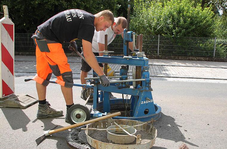 Zunächst sorgten hässliche Löcher im Asphalt für Irritation bei den Bürgern. "Die haben wir mit Absicht gemacht", erklärt Polier Norbert Zink. Darunter liegen die Kanaldeckel, die am Montag und Dienstag von den Bauarbeitern freigeschnitten und mit Hilfe eines Schachthebegeräts auf die richtige Höhe angepasst werden.