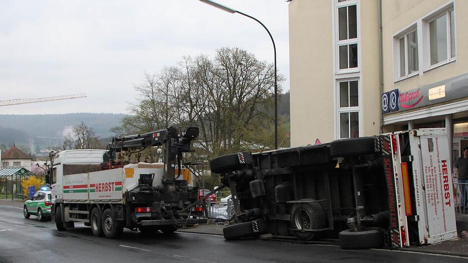 Ein mit Zementsäcken beladener Lkw-Anhänger ist am Dienstag, 12. April, am Schwaneneck umgekippt. Der Lastzug kam die Fuldaer Straße hinunter und wollte links in die Kissinger Straße einbiegen. Dabei geriet der Anhänger aus dem Gleichgewicht und stürzte auf Höhe von Tele-Profi um. Dabei wurde eine Mauer beschädigt, verletzt wurde aber niemand. Die Polizei schätzt den Schaden am Lkw jedoch auf etwa 5000 Euro. Der Schaden an der Mauer und dem dazugehörigen Geländer dürfte sich auf grob 1000 Euro summieren.