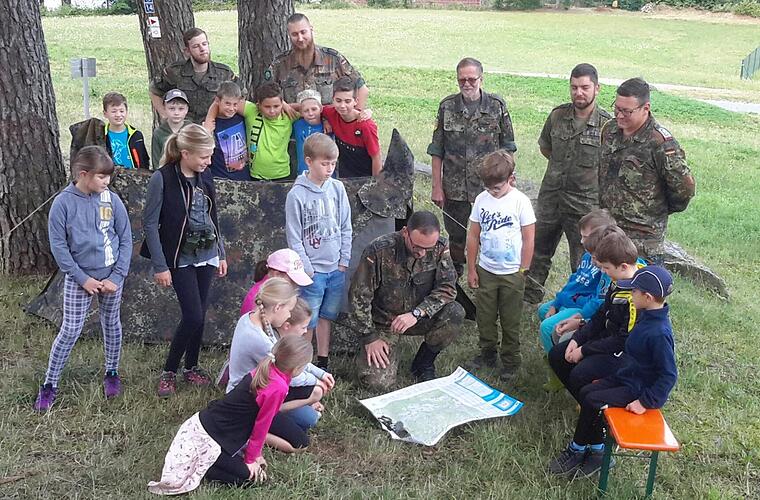 Zu Beginn wurde erst einmal ein kleines militärisches Feldlager mit mehreren Zelten aufgebaut, denn die nächsten Stunden sollten so realitätsnah wie möglich über die Bühne gehen. Auch die entsprechende Feuerstelle durfte natürlich nicht fehlen. Voll konzentriert lauschten die Kinder den Ausführungen der Soldaten, als die Experten die richtige Handhabung von Karte, Kompass und Fernglas erklärten. Das erworbene Wissen konnte dann gleich bei der Orientierung im Gelände in die Praxis umgesetzt werden.