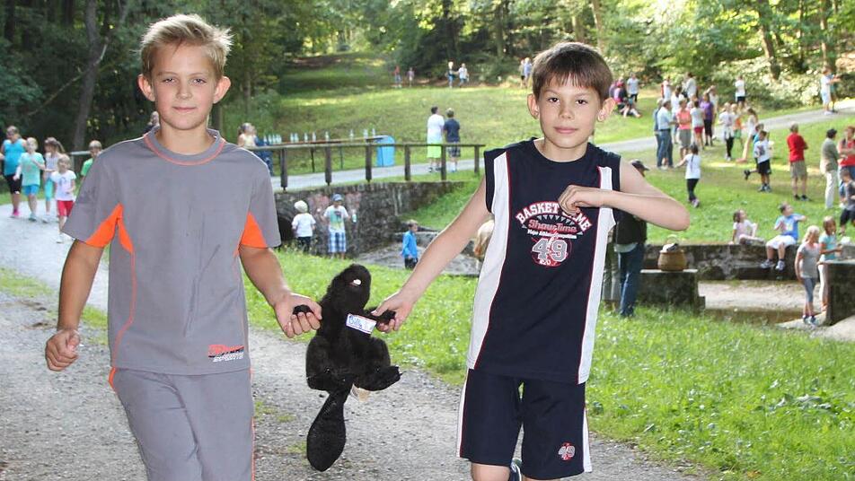 Sogar ein Maskottchen läuft mit. "Billy", ein plüschiger Biber, wird von Valerij und Florian durch den Wald getragen. Das Kuscheltier ist der Glückbringer der 4. Klasse - und darf natürlich nicht beim Großereignis fehlen.