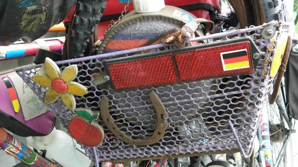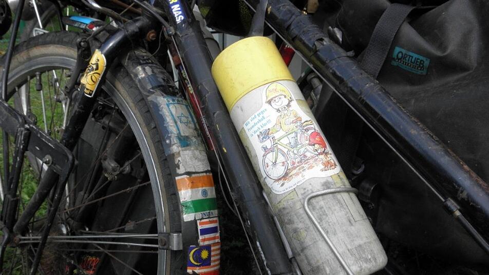 Ihre Mountainbikeräder kosteten damals jeweils etwa 1300 Mark, bestehen aus Stahlrahmen, die man weltweit schweißen kann, wie Elena Erat beschreibt. An den Lenkern hängen noch die mittlerweile angestaubten Fahrradkörbe, wie sie in den 1990er Jahren üblich waren. Wasserfeste Packsäcke klemmen an ihren Halterungen an Vorder- und Hinterrädern, der Zeltsack ist auf dem Gepäckträger verzurrt. Ziemlich jede Stelle an Rahmen und Schutzblechen ist mit Aufklebern bedeckt. An einem der beiden Räder ist der gefaltete Ersatzmantel vorne befestigt, Hupe, Rückspiegel und große Fahrradklingel lassen sich entdecken, Rahmentäschchen sind mit Klettband befestigt und die damals üblichen günstigen Trinkflaschen in Pink sind ebenfalls noch dabei.