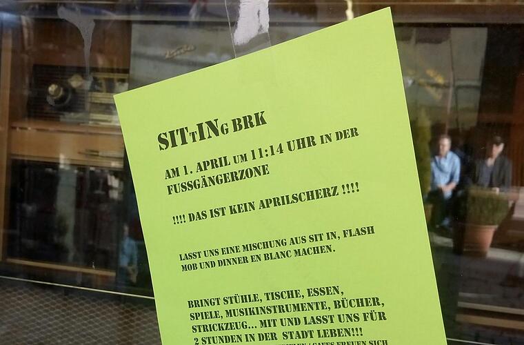 Die Initiatoren rufen dazu auf, am Samstag, 1. April, um 11.14 Uhr, in die Stadt zu kommen. "Bringt Stühle, Tische, Essen, Spiele, Musikinstrumente, Bücher, Strickzeug ... mit und lasst uns für zwei Stunden in der Stadt leben", heißt es auf dem Zettel. Unter dem Motto "SITtINg BRK" soll eine Mischung aus Sit In, Flashmob und Dinner en blanc angestoßen werden.