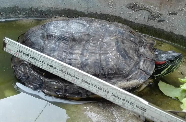 Die Schildkröte wurde von der Leimbach angeschwemmt. Die Besitzer können sich jederzeit in der Leimbachstraße 25 melden und ihre Schildkröte abholen. Mehr Infos gibt's bei Manuel Frank. Tel.: 0176/ 78511517.