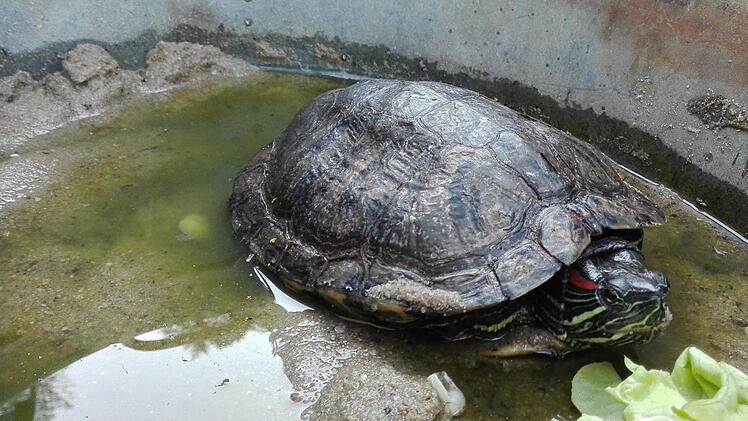Eine etwa 20 Zentimeter lange Rotwangen-Schmuckschildkröte hat Manuel Frank auf seinem Grundstück gefunden. Ob das Tier einfach ausgebüxt ist oder ausgesetzt wurde, ist unklar.