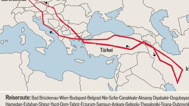 Im Iran fuhr die Gruppe einen großen Kreis: Von der türkischen Grenze aus im Westen nach Süden, vorbei an schneebedeckten Bergen, dann nach Südosten durch Steppe und Wüste. Bei mehr als 40 Grad Celsius fuhren die Drei aber nicht bis zum Persischen Golf, sondern bogen etwa 50 Kilometer nördlich wieder nach Nordwesten ab.