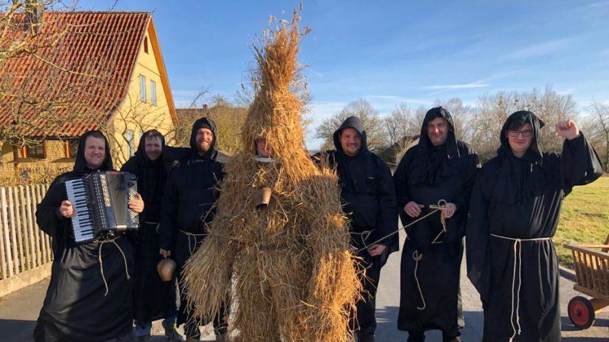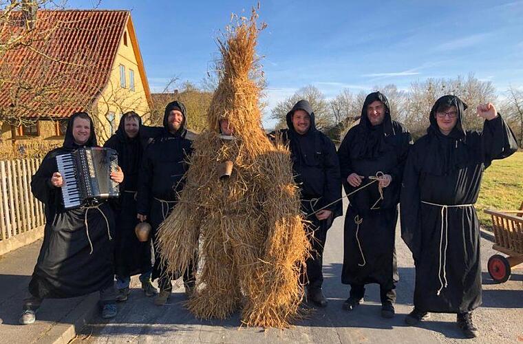 Der junge Mann wurde rundum mit Stroh eingebunden, Kuhglocken zierten seine Taille, und an einem langen Seil führten die Vereinsmitglieder ihn, begleitet von Akkordeonmusik, durchs Dorf. An vielen Häusern wurde Station gemacht, und die von den Bewohnern großzügig gespendeten Lebensmittel im mitgeführten Bollerwagen verstaut. Eier, Speck, Brot, Würste, Kuchen und natürlich auch die ein oder andere Flasche Schnaps fanden sich am Ende darin.