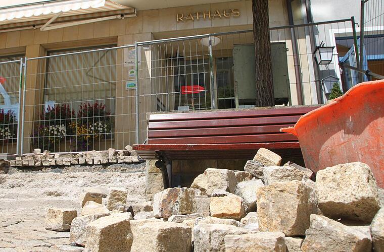 Direkt vor dem Rathaus wird gebaut. Doch die Arbeiten ruhen zur Zeit. Hintergrund ist, dass die Schäden an der Treppe größer sind, als zunächst angenommen.