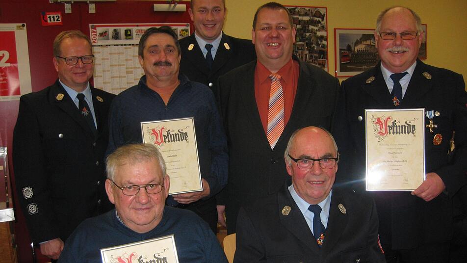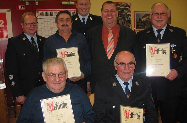 Im Rahmen der Jahreshauptversammlung wurden geehrt: Oskar Gerlach für 40-jährige Feuerwehr-Zugehörigkeit, Reinhold Wießner und Herbert Beck für 50-jährige Zugehörigkeit, Reinhold Spahn für 60-jährige Mitgliedschaft. Hubert Schneider und Erwin Hahn wurden zum Ehrenmitglied ernannt. Christian Beck, Johannes Beck, Florian Spahn und Stefan Leitsch wurden zum Löschmeister ernannt. Lisa Karges erhielt die Ernennung zur Feuerwehrfrau, Manuel Müller und Julian Hüfner wurden zum Feuerwehrmann ernannt.