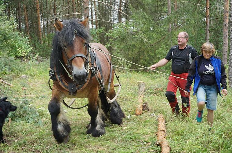 Die 14-köpfige Gruppe wird bei dieser Arbeit vor allem durch  Igor unterstützt. Das Rückpferd ist bestens für die Forstarbeiten  geeignet. Betreuer  Wolfgang Klüber: "Es ist wichtig, dass das Pferd  ruhig ist. Igor hat ein Gemüt, ihn bringt nichts aus der Ruhe." Mit  dabei auch Uwe Steigemann, Ranger im Biosphärenreservat bayerische Rhön,  der die Gruppe seit Anfang an begleitet und selbst auch tatkräftig mit  anpackt. Steigemann und Klüber kennen sich noch aus Jugendzeiten bei der  Deutschen Waldjugend und sind über dieses Projekt in Kontakt geblieben. Übernachtet wurde in der Umweltbildungsstätte in Oberelsbach, so blieben  die Anfahrtswege zum Dünsberg kurz.
