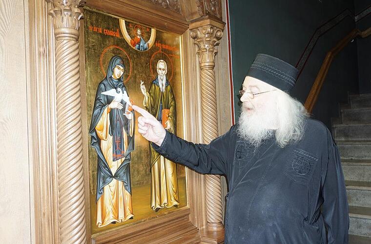 In den nächsten Wochen wird Pfarrer Hölldobler nach Griechenland reisen und ein Wandgemälde mitbringen, das künftig den Treppenaufgang der orthodoxen Kirche zieren wird. "Das Wandgemälde wird die Entschlafung des Heiligen Mönchsvaters Benedikt zeigen, der als österlich auferstandener Christ im Stehen sterben wollte, an den Armen gestützt von Brüdern."