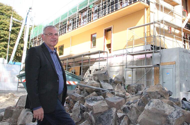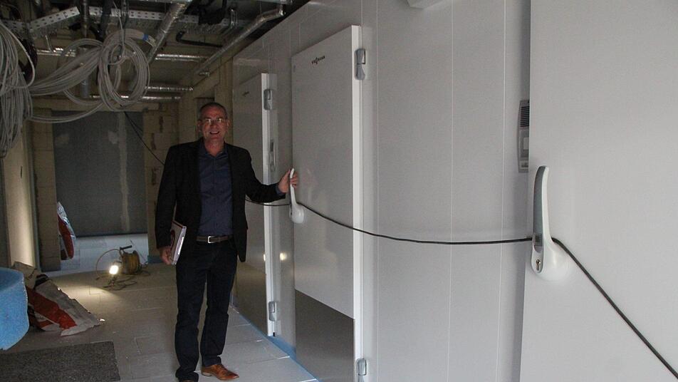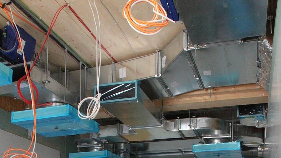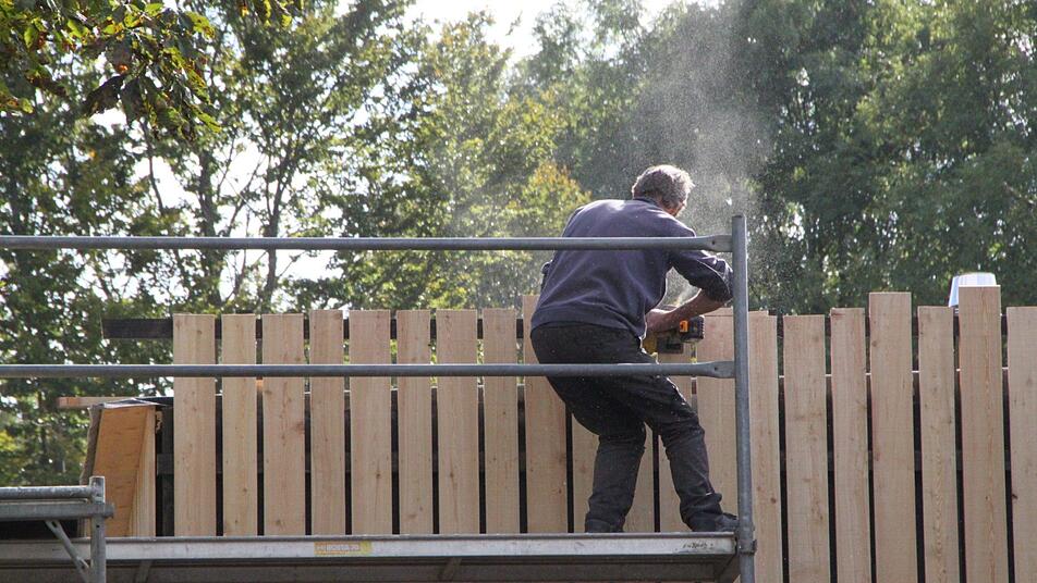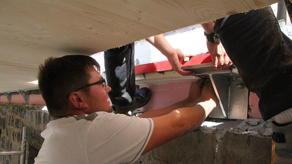 "Wir sind sehr zufrieden mit den Baufirmen", sagt Wolfgang Reith von der Hochbauabteilung des Landratsamts Bad Kissingen. "Es läuft alles. Wir sind voll im Terminplan." Draußen machen sich Jens Reugels, Junior-Chef der gleichnamigen Firma, und sein Kollege am Balkon zu schaffen. Sie bringen Stützen aus Metall an, die die Konstruktion tragen.