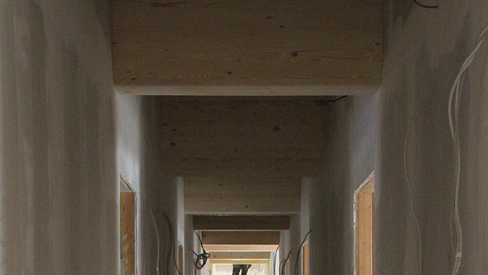 Innen sind die Wände inzwischen gespachtelt und geglättet. Kabel wurden verlegt und hängen aus den Öffnungen. Vier Kühlräume im Keller sind fertig. Vor einer Woche verfüllten die Arbeiter den letzten Estrich im Untergeschoss. Im Obergeschoss streicht ein Arbeiter Lasur aufs Holz. Die zehn Gästezimmer, von denen zwei barrierefrei ausgebaut werden, wirken noch kahl. Fliesen und Sanitäranlagen fehlen noch in den Bädern.
