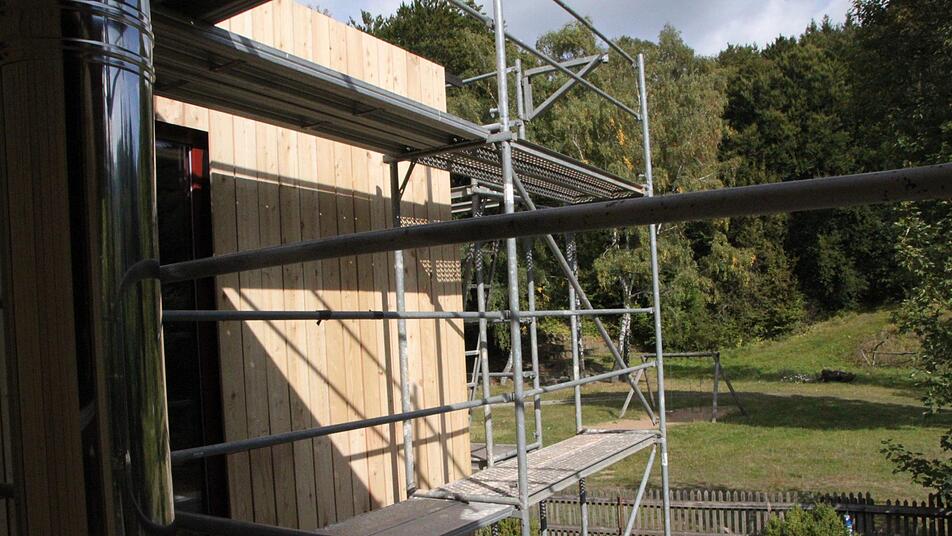 Der Bau des neuen Berghauses Rhön liegt im Zeitplan. Die Fassade aus naturbelassener Lärche soll den Hüttencharakter garantieren. Doch das braucht Zeit.