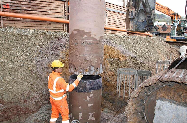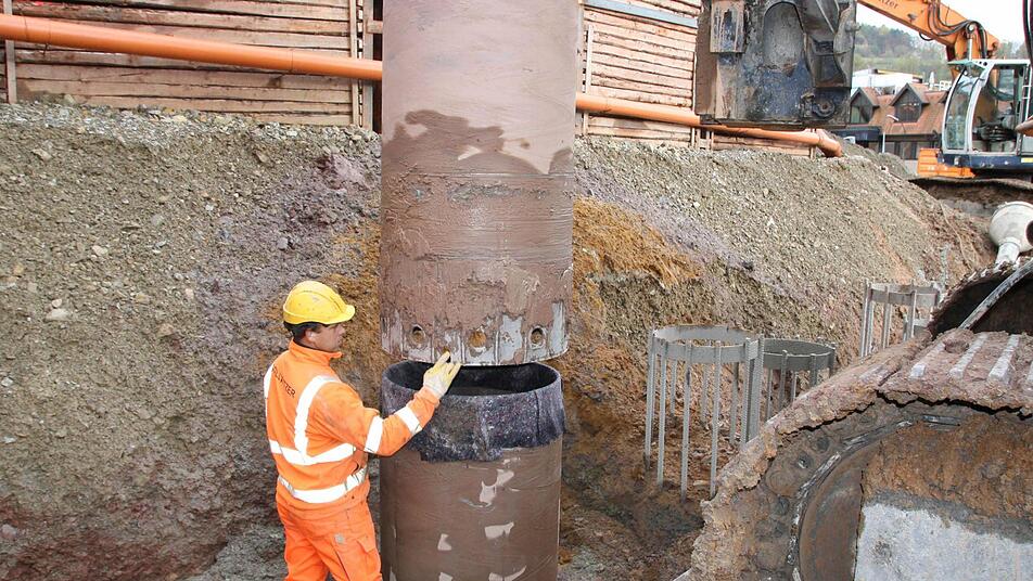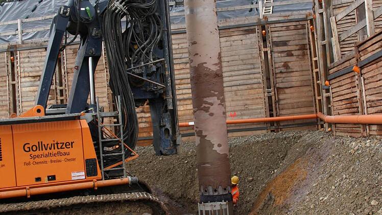 Die Idee ist einfach: Man bohrt Loch für Loch nebeneinander, füllt jedes mit Stahlbeton, lässt das Ganze aushärten und hat anschließend eine stabile Wand, die man auf einer Seite abgraben kann. Die Ausführung dagegen erfordert schwere Spezialmaschinen: 90 Zentimeter beträgt der Durchmesser des Bohrers, der sich 14 Meter tief in den Untergrund der Baugrube des neuen "Hauses Waldenfels" frisst. "Wir sind sieben Meter im Felsen, da dürfte jetzt nichts mehr passieren", sagt Thomas Fütterer, der bei der Spezial-Firma Gollwitzer für die Arbeiten zuständig ist.