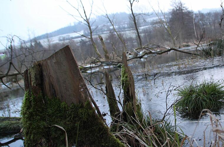 Ausblick auf die Auenlandschaft Direkt am Weg, der vom Staatsbad in Richtung Wernarzer Hütte führt, liegt das Biberrevier. Spaziergänger können von oben auf die überschwemmten Wiesen blicken und wer weiß, wo er suchen muss, findet die große Biberburg mit bloßem Auge. "Man geht dran vorbei, ohne es zu wissen", sagt Hildmann.