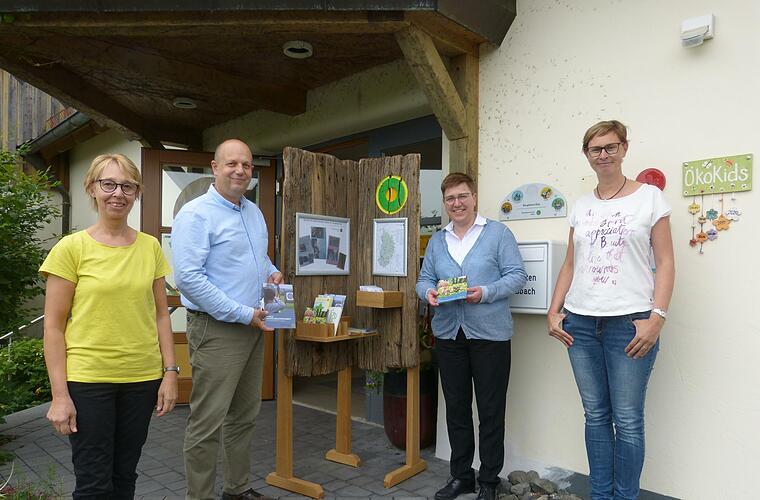Michael Dohrmann vom Verein Naturpark & Biosphärenreservat Rhön (NBR) e. V. übergab die Biosphären-Ecke an Kita-Leiterin Monika Enders, ihre Kollegin Marisa Herbert und Oberelsbachs Bürgermeisterin Birgit Erb. In der Ecke, die sich insbesondere an das Kitapersonal sowie an Eltern richtet, finden sich Aktionsvorschläge, was in der Umgebung zum Thema Natur und Kultur erlebt werden kann, Infos zu aktuellen Projekten der Kita und eine Übersicht der Partnereinrichtungen aus dem Biosphärenreservat. Gebaut wurde das Gestell von einer Schreinerei aus der Region - aus alten Bohlen des Naturlehrpfads im Schwarzen Moor, der in den vergangenen Monaten umfangreich saniert worden war.