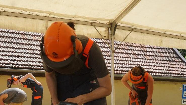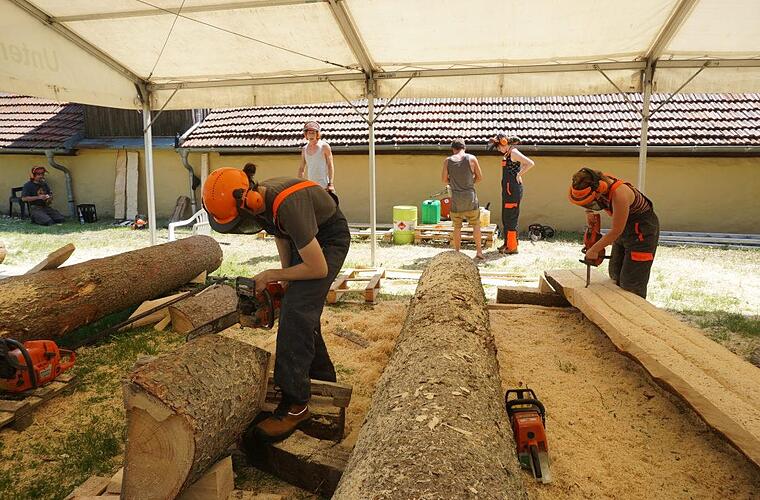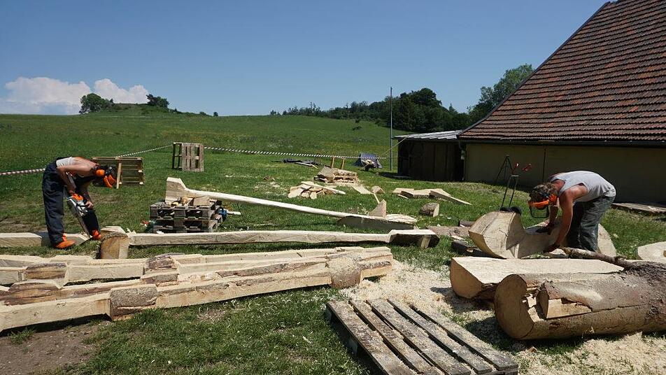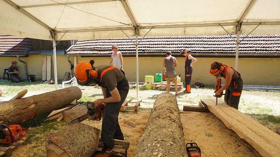 Strahlender Sonnenschein, blauer Himmel und ein schattiges Plätzchen unter den Bäumen - so lässt es sich arbeiten. Dreizehn Schüler des zweiten Ausbildungsjahres der Staatlichen Berufsfachschule für Holzbildhauer sind gemeinsam mit vier Gästen aus der Schnitzschule Empfertshausen zum ersten außerordentliche Symposium an der Jungviehweide oberhalb Weisbachs zusammen gekommen. Gemeinsam arbeiten sie an einem Kunstwerk, das in den nächsten Monaten an unterschiedlichen Standorten ausgestellt werden wird.