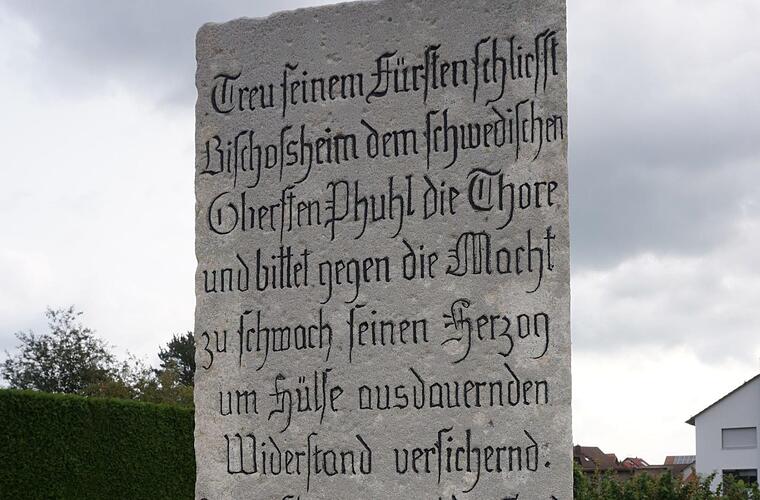Den Archivaren war klar, dass der Schwedenstein erneuert werden müsse, da er Bischofsheimer Geschichte erzählt. Er erinnert an die Zerstörung der Stadt. Diese Geschichte haben die Archivare recherchiert und einen Bericht von Landrichter Eysel gefunden: "Namentlich wurde die Stadt Bischofsheim 1639 abermals von den Schweden bedroht. Eine Abteilung der General Bannerschen Truppen unter dem Kommando des Oberisten Pfuhl zog vor die Stadt und forderte sie zur Übergabe auf. Die Einwohner waren in den Vorjahren durch den Krieg bereits weitgehend zur Verzweiflung gebracht, während sie durch Eilboten, den Fürsten um Hilfe anflehten. Die Schweden, welche hierauf die Stadt mit Sturm entern wollten, wurden von den Bürgern zwei Mal zurückgeworfen. Beim dritten Sturm aber warfen sie Feuer ein und steckten das untere Tor in Brand, welches sich über einen großen Teil der Stadt ausbreitete."