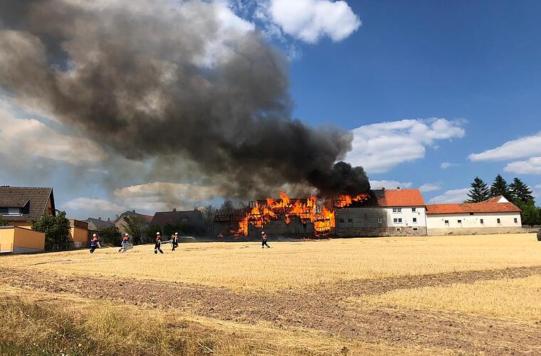"Es ist ein massiver Brand", sagte Kreisbrandmeister Alexander Marx, der für die Öffentlichkeitsarbeit zuständig ist. Die erste Alarmierung ging um 15.15 Uhr raus. Schon während der Anfahrt der Feuerwehr wurde aus der brennenden Scheune ein Vollbrand. Die Ursache für das Feuer war am Abend noch unklar. Die Trümmer glimmten, und Rauch stand in den Straßen. "Solange das noch qualmt, können wir noch keine Brandermittler ranlassen", betonte Andy Laacke, Pressesprecher des Polizeipräsidiums Unterfranken.