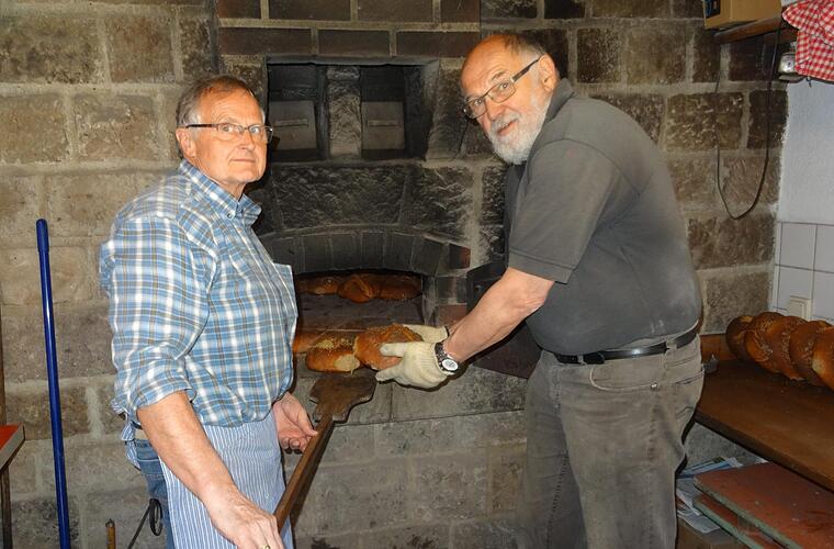 Winfried Bott und Siegfried Wiesner vom Obst- und Gartenbauverein (OGV) Bad Brückenau schürten am Samstagmorgen den Ofen im Backhaus und fertigten den Teig. Anschließend wurden über 50 Brote bei frühlingshaften Temperaturen gebacken. Diese wurden im Anschluss an den Gottesdienst in der katholischen Stadtpfarrkirche alle verkauft. Es kamen 245 Euro zusammen.
