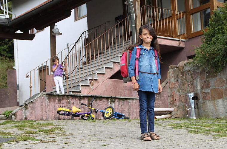 Hana ist schüchtern, aber sie lächelt. Mit ihrer Schultasche gerüstet macht sie sich auf den Weg zur Schule. Für das Foto natürlich, aber am Dienstag, 16. September, dann auch wirklich - so wie alle Kinder im Altlandkreis Bad Brückenau, für die der Unterricht wieder be ginnt. "Die Kinder haben sich sehr gefreut auf die Schule", er zählt Daniela Schad von der Flüchtlingsberatung der Caritas. Schon im vergangenen Schuljahr gingen manche der zwischenzeitlich bis zu 30 Kinder, die in der Gemeinschaftsunterkunft in Volkers wohnen, in die Schule nach Bad Brückenau. "Aber ich glaube, sie freuen sich auch jetzt", fügt Schad an. Denn für die Kinder sei es doch recht langweilig im ehemaligen Rhön-Hotel Berghof.